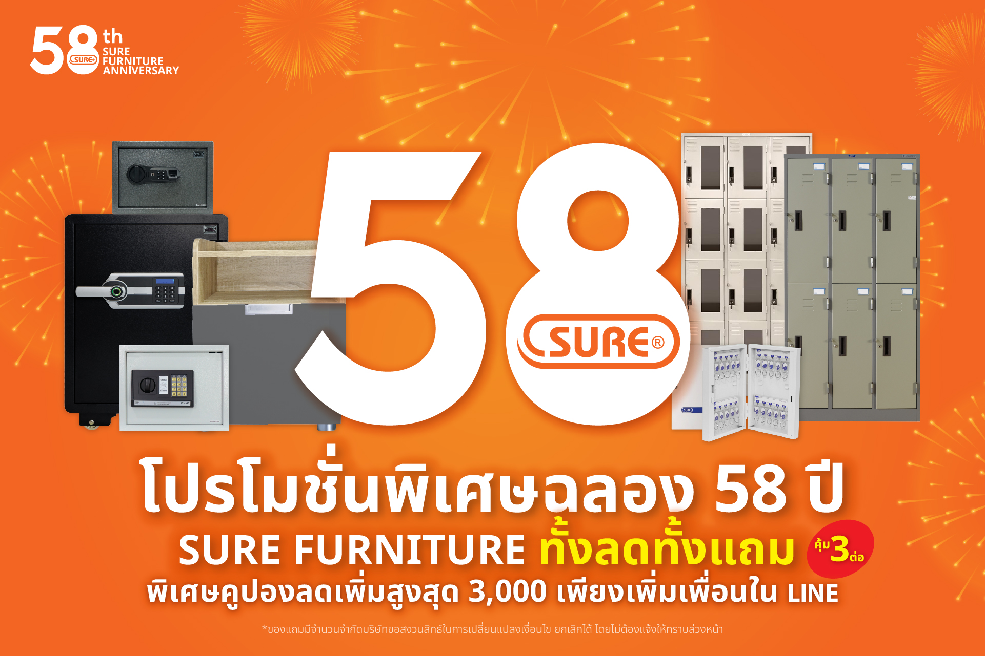 SURE Furniture จัดโปรโมชั่นสุดยิ่งใหญ่ ฉลองครบ58ปี ลดจัดหนัก คุ้มจัดเต็มสินค้าหมวดพิเศษลดกระหน่ำ โปรแถมสุดพิเศษ 1 แถม 1 แอดไลน์รับสิทธิพิเศษเพิ่มเติมตั้งแต่ 4 มิ.ย. - 30 มิ.ย. 2567