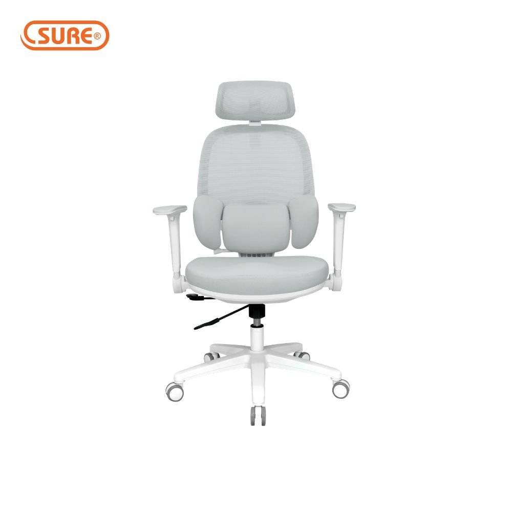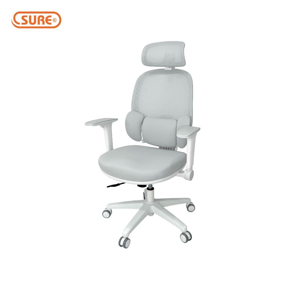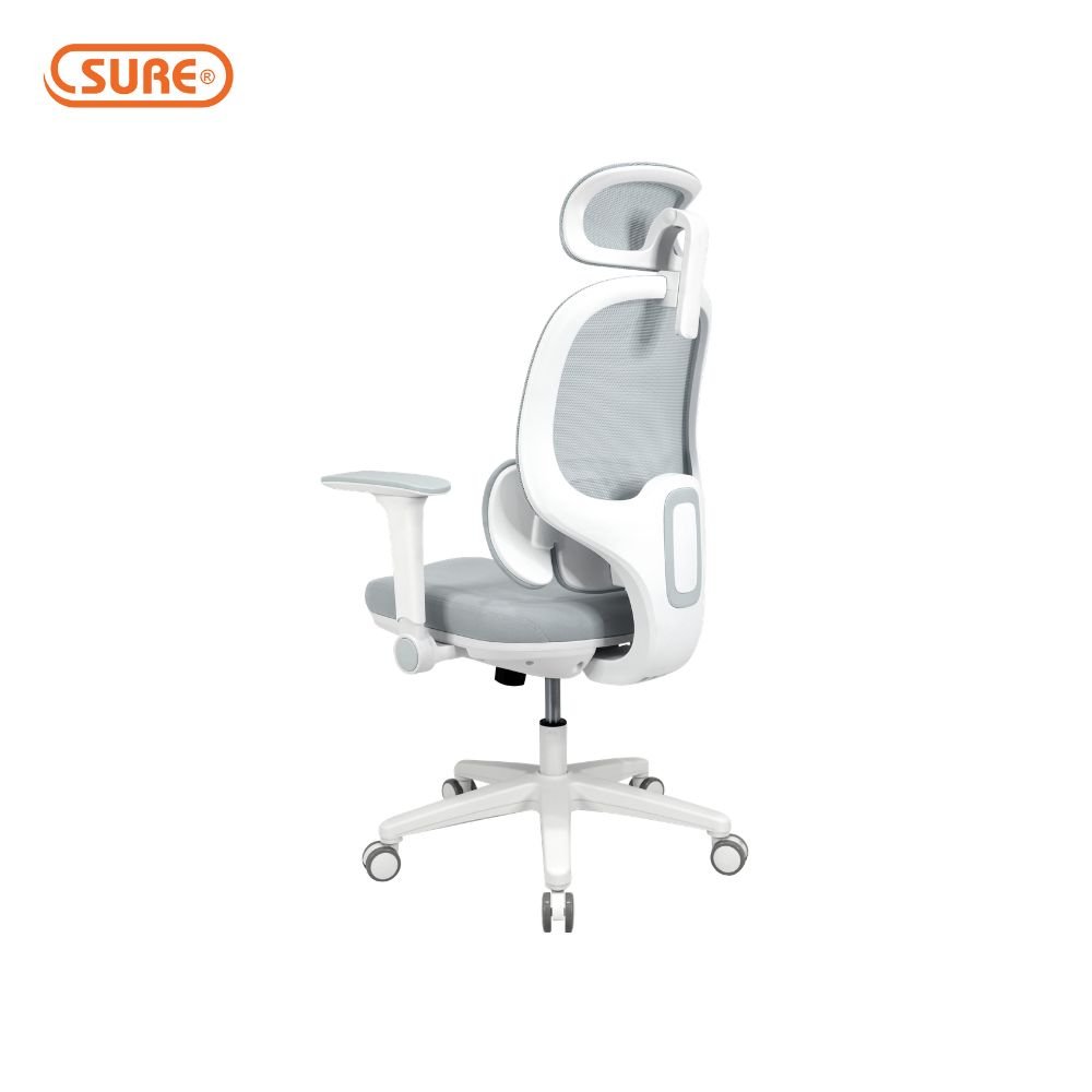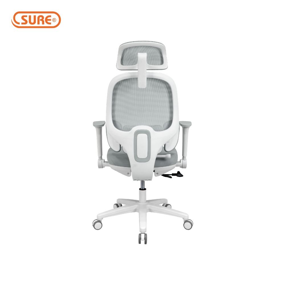 พนักพิง : โครงพนักพิงวัสดุ PP ฉีดขึ้นรูปสีขาว หุ้มด้วยผ้า ตาข่าย Mesh ยืดหยุ่นสูงระบายอากาศได้ดี มี Lumbar Support แบบแยกชิ้น บุฟองน้ำหุ้มด้วยผ้า ดีไซน์แบบปีกที่สามารถปรับปีกหมอนรองทั้งสองข้างเพื่อโอบรับสรีระผู้นั่ง ช่วยรองรับสรีระได้เต็มแผ่นหลัง ปรับระดับความสูง Lumbar ได้ สามารถปรับล็อคตำแหน่ง Lumbar เพื่อช่วยปรับท่าทางการนั่งให้หลังตรง